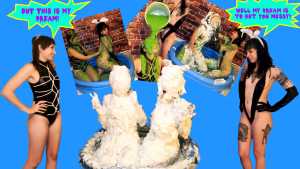 The scene starts out with Larz telling Daisy shes gonna get her messy with slime. To which Daisy accepts and takes a huge bucket of it. Then Larz tells her that she also dreams of pies. Daisy asks where all the pies came from as Larz pies her in the face. She cleans Daisy's face off only to pie her with a 2nd pie right after. Daisy gets 4 more pies, getting totally covered in the process before finally pieing Larz in her face. Daisy grabs a 2nd pie, and Larz accepts what's about to happen, and gets clobbered with the 2nd pie. They pie each other at the same time soon after and then Larz says: I wish there was more pies in our dream and Daisy agrees. They then both get hit with thrown pies from off camera. After wrestling around with each other a bit, they put their heads next to each other, when Larz says: I wish we had a big pie in our faces right now, Daisy's says uh-huh, lets dream of the biggest pie... when shes cut off by a huge pie hitting them both in their faces. They're both totally covered in pie at this point, but that's when the cans of shaving cream begin to spray. They both get sprayed nonstop with shaving cream, and they're both perfect targets, as they sit there, never moving, and allow themselves to get covered in shaving cream. They're both unrecognizable, and their entire heads are just a blob of shaving cream by the end. They both get destroyed in this scene and take everything that's thrown at them and are glad to do so!