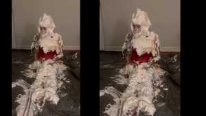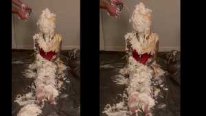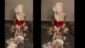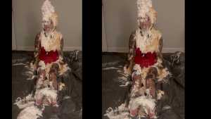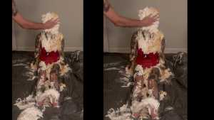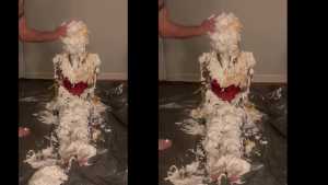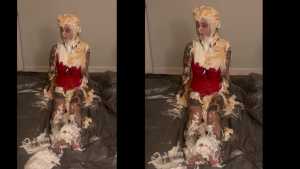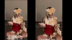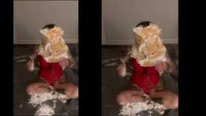Watch Ginny have several pies completely engulf her face and feet slopped up with cream. Her head gets covered in so much cream it almost becomes cartoonish!