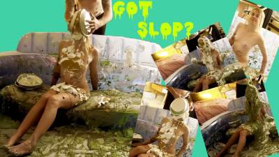 The slime quality is smoother, but still thick with the three white slimes that follow the first green sliming. By the end, Alex is coated. The final 30s has Alex fill a bowl of pooled gloop, and ceremoniously dump it over her own head.